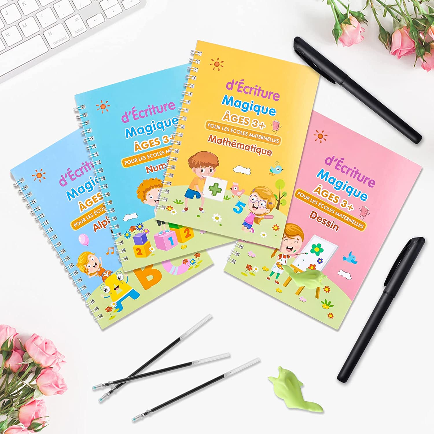 4 Cahiers Magiques 3D Réutilisables + 10 Stylos – Disponible en Français, Anglais et Arabe